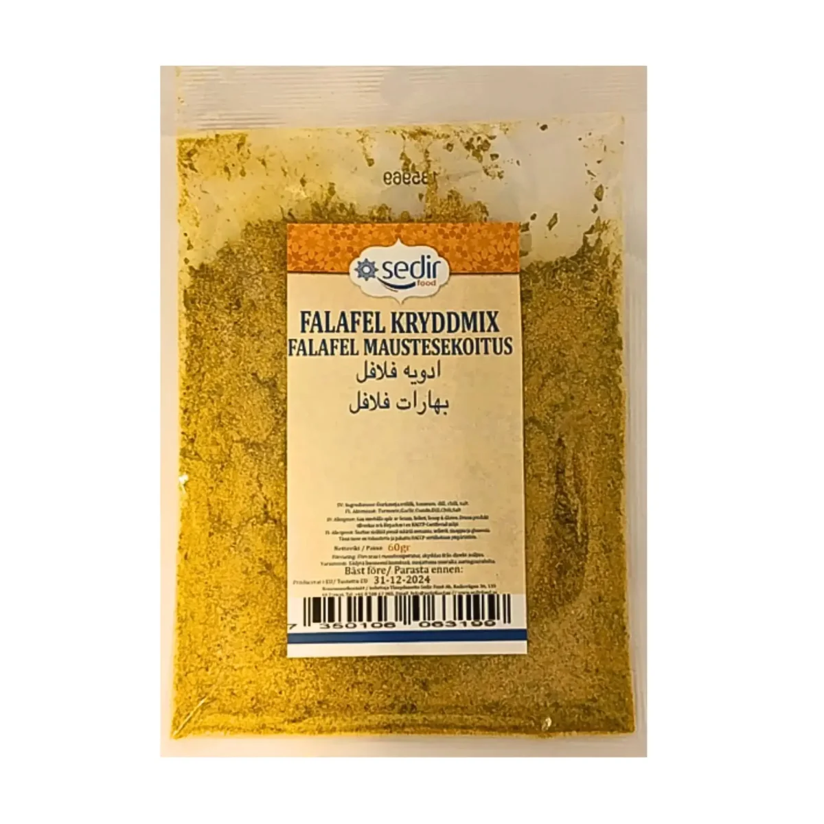 Falafel krydda påse Sedir är en kryddblandning som används för att tillaga falafel, en välkänd rätt från Mellanöstern som görs av kikärtor, lök och kryddor. Falafel är populärt som en hälsosam veganrätt som kan serveras som en del av en måltid eller i en pitabröd.