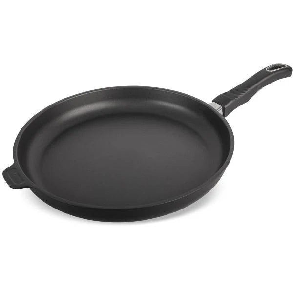Pannan kan användas på alla typer av spisar, inklusive induktion, och det avtagbara handtaget gör den praktisk för både matlagning och förvaring.