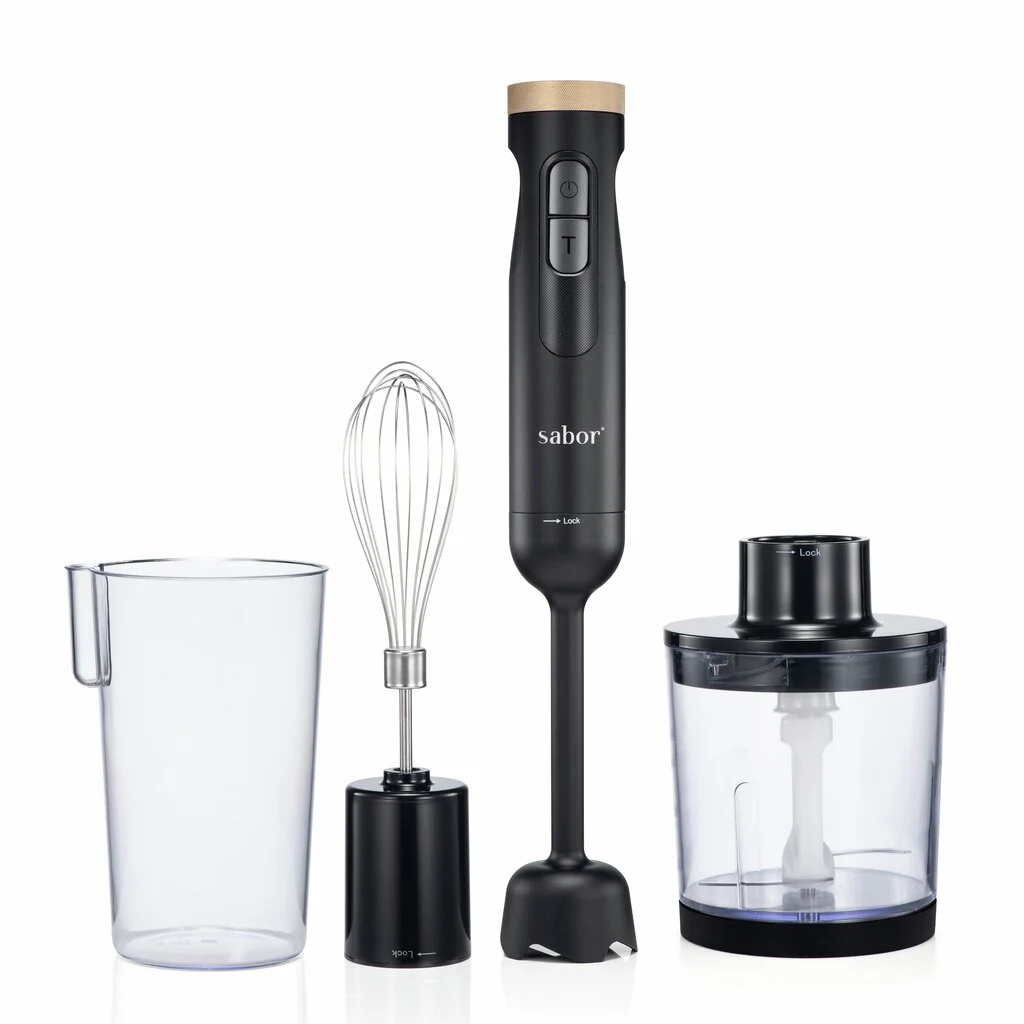Vill du göra matlagningen enklare och snabbare? Med Sabor Ultimate stavmixer får du en kraftfull 1000W motor och 9 justerbara hastigheter som ger dig full kontroll, oavsett om du mixar soppa, gör smoothie eller vispar grädde. Setet innehåller stavmixer, minihackare på 500 ml, mixerkanna på 600 ml och visp – allt du behöver för att hacka, mixa och vispa med fina resultat. Det ergonomiska handtaget ligger bekvämt i handen och delarna är enkla att rengöra efter användning.